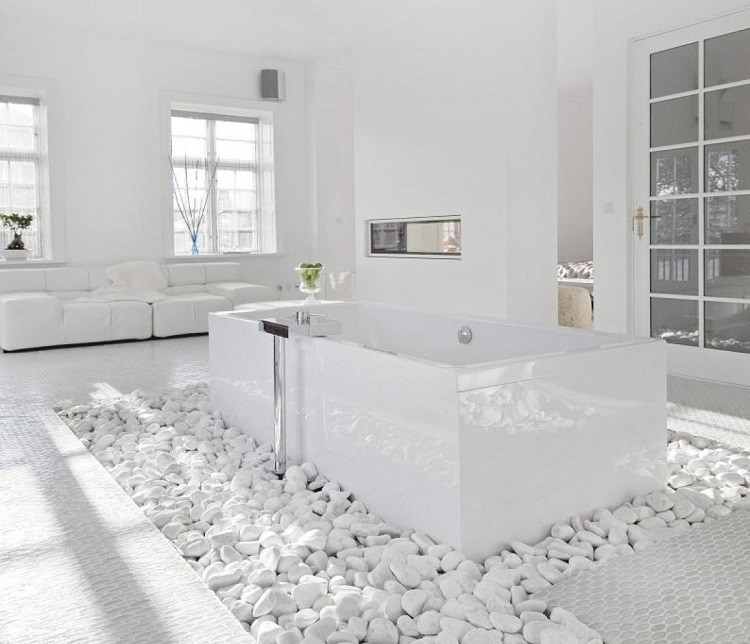 Pebbles are an excellent choice when you want to add texture and diversity to a white bathroom interior. They may have natural grayish or beige hue which will be a pleasant touch and increase the aesthetic value of the room.