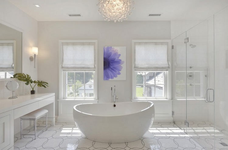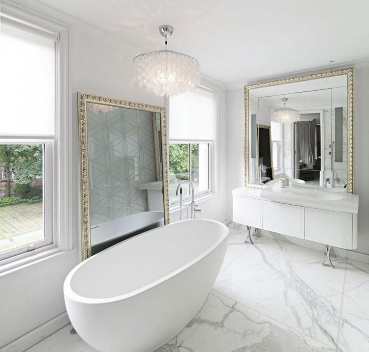 Proper lighting and mirrors will help to make a white bathroom incredibly comfortable. Experiment with LED lighting or colored lighting and you can easily to change the color of the room according to your mood. A large crystal chandelier make a white bathroom look grand!